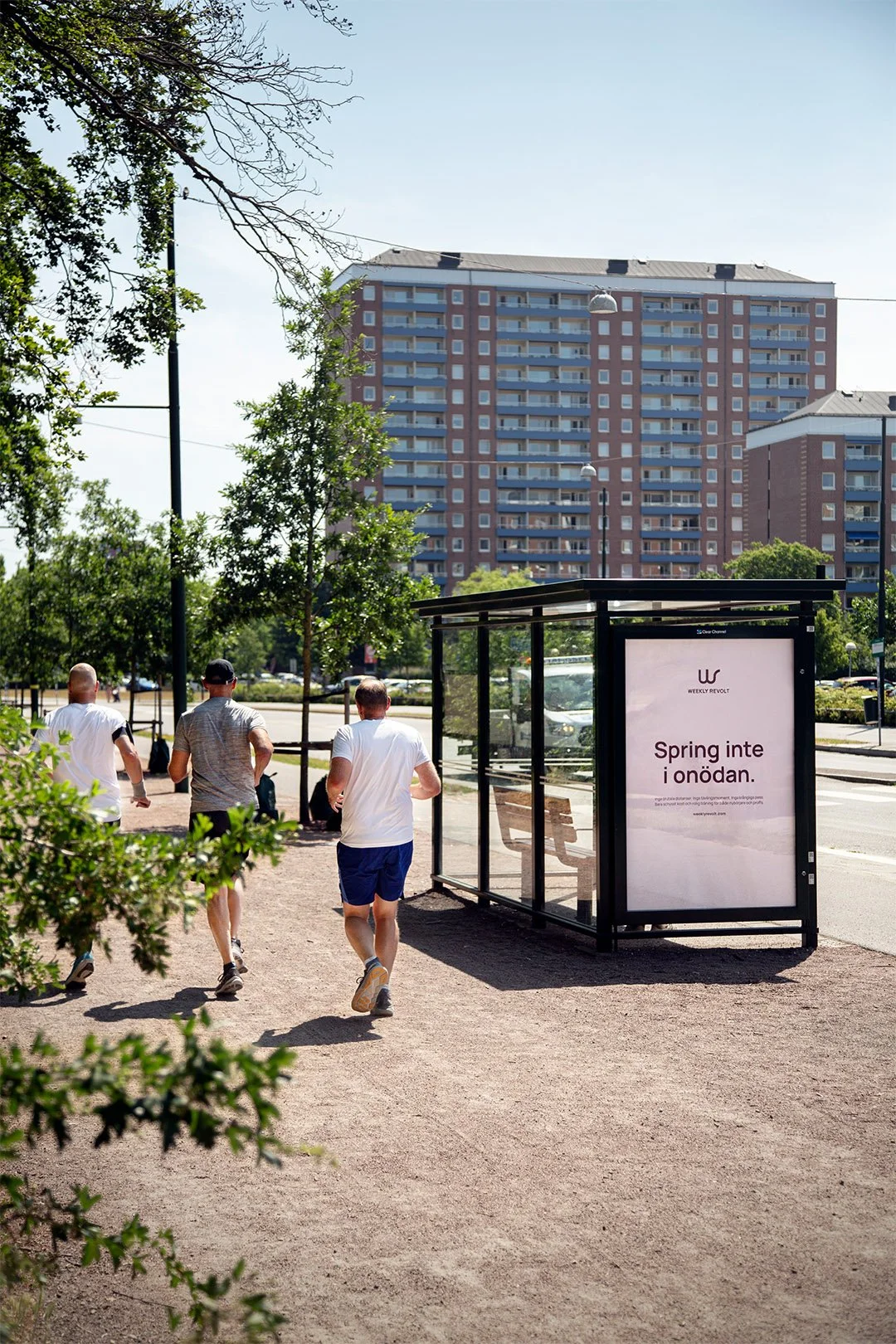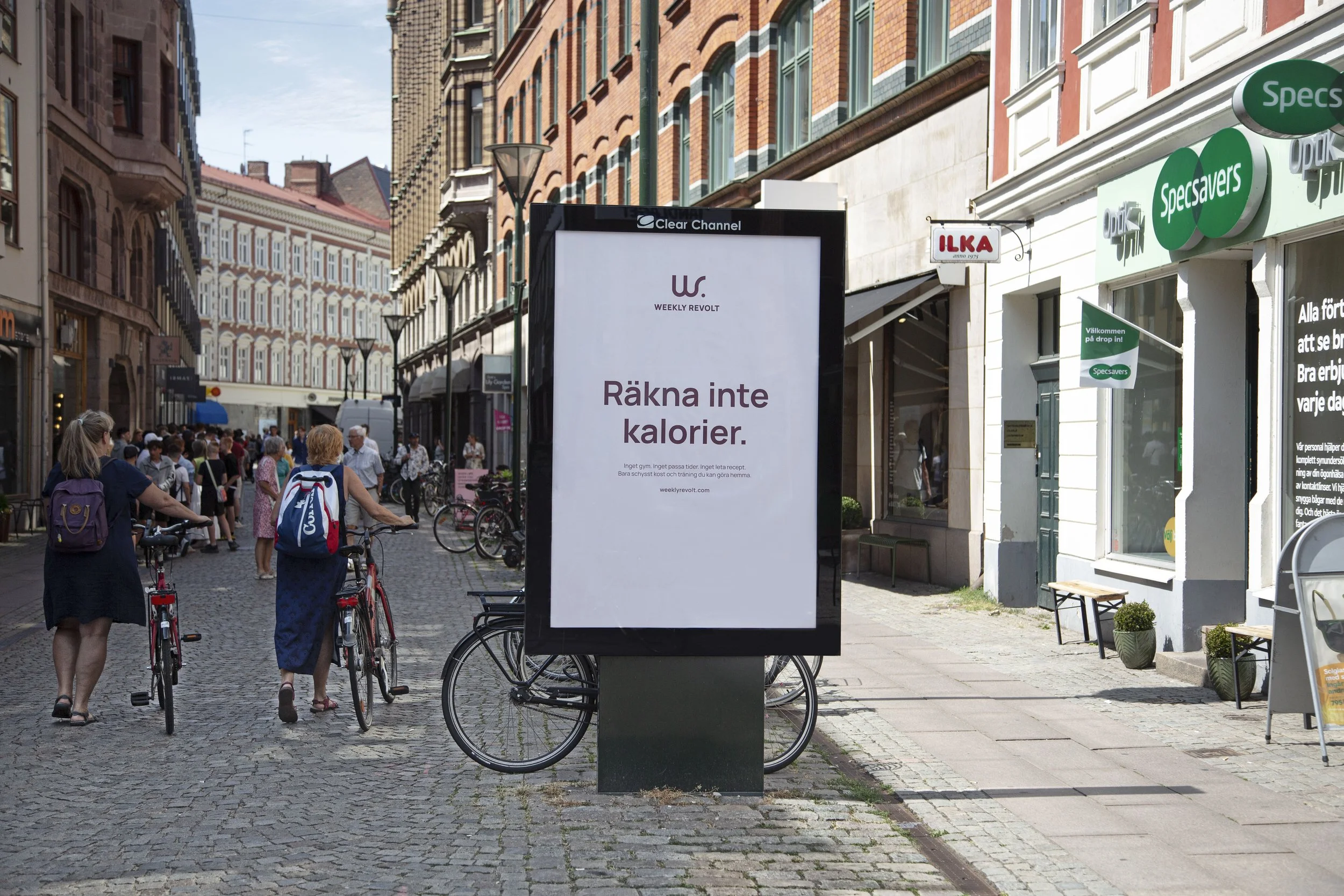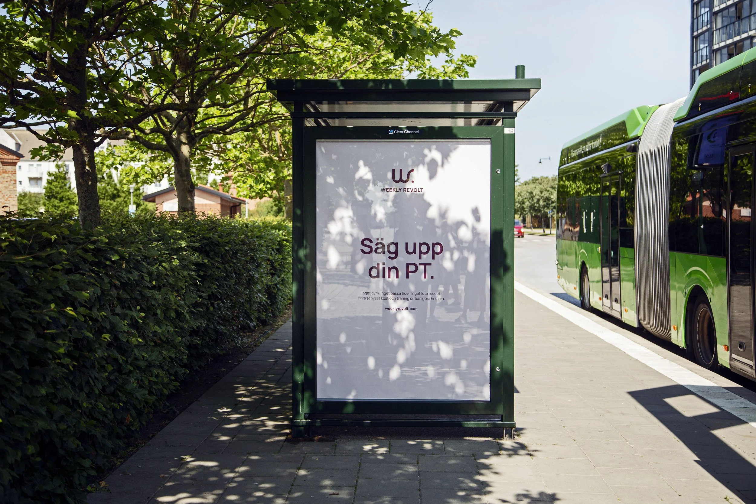 En varumärkesbyggande utomhuskampanj där Weekly Revolt utmanar synen på kosthållning och träning. Budskap så som “Köp inte gymkort” kunde man bland annat se på en stortavla bredvid ett gym i Malmö, där kampanjen gick på både statiska och digitala annonsytor. Enheterna syntes utspridda i region Skåne under sommaren och hösten 2023.